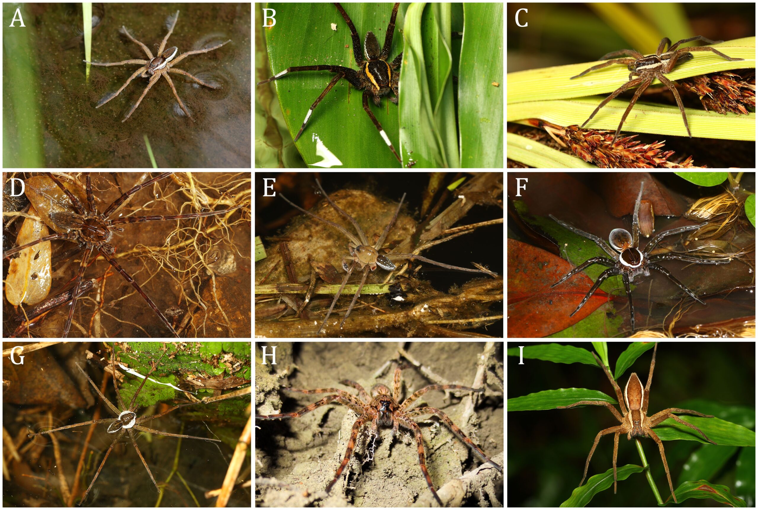 These spiders typically sit in wait on vegetation, floating leaves, or bank edges. When the water vibrates, they sprint across the surface or dive to seize prey. Their foraging is flexible: they capture both aquatic and stranded terrestrial insects.